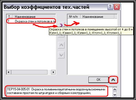 Рис. 1.6.12. Выбор коэффициентов тех. частей 9. В локальную смету добавляется строка расценки, где в 4 графу в верхнюю ячейку введите объем с учетом единицы измерения данной расценки (в 4 графе в нижней ячейки).