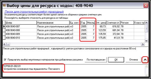 где Кматериала - количество неучтенного материала Красценки – общее количество по расценке (работе) Норма расхода неучтенного материала В случае если у расценки есть неучтенный материал, при ее добавлении иногда открывается окно «Выбор цены ресурса с кодом:…» (рис. 1.6.15.), в котором можно выбрать нужный материал из ССЦ на текущую дату (по дате привязки цен), т. к. по умолчанию программа ищет в сметно-нормативной базе стоимость материала по его коду (шифру) по дате привязки цен.