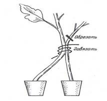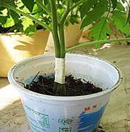 Один куст помидоров на двух корнях Можно вырастить один куст помидоров на двух корнях, при этом место экономится, и урожай будет больше. Можно получить с одного такого куста до 50-60 помидоров. Не важно, какой сорт. Для этого в одну емкость садят семена рядом друг от друга - на расстоянии не более 1 см. Когда рассада вырастет и толщина стебля будет достаточно большой, нужно острой бритвой снять верхний слой стеблей двух соседних растений со сторон, которыми они обращены друг к другу, для чтобы обнажился камбий. Длина разреза примерно 2-3 см. Затем соединить обнаженные участки стеблей и плотно обмотать это место ленточкой из пленки шириной около 1 см. Ну и выращивать как обычную рассаду. Незадолго до высадки рассады в грунт, у слабого из растений, которое развилось немного хуже, прищипнуть верхушку и над срезом оставить около 3-5 см. Пересаженное в грунт растение соединенного помидора быстро развивается, потому, что обладает уже мощной корневой системой. Когда оно более-менее окрепнет, пленку осторожно можно снять. Уход за сдвоенным кустиком помидора различается тем, что поливать и подкармливать его надо более чаще и обильнее, учитывая наличие двух корней у растения. При посадке желательно поставить хорошую- надежную опору, так как куст получается значительно крупнее обычного.