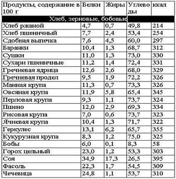 Таблица содержания белков, жиров и углеводов в разных видах хлеба, зёрен, бобов.