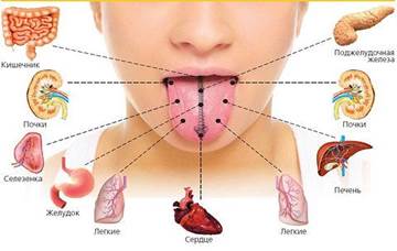 Язык, помимо прочих важных функций, служит зеркалом организма – по нему можно определить и состояние иммунитета, и диабет, и проблемы с почками. Считается, что чистый язык, без налета - признак здоровья пищеварительной системы. Но здесь все не так просто. Язык способен отражать состояние практически всех органов и систем. Например, кончик языка отвечает за тазовые органы, середина слева - за печень, а справа - за селезенку. Боковые края показывают состояние легких - правого и левого. И так далее. Толще налет – глубже болезнь * Одельные участки поверхности нашего языка спроецированы многие органы. Например, желудок – на всей средней части языка, печень – на уровне малых коренных зубов, а на кончике языка – сигмовидная и прямая кишка. Поэтому любые заболевания этих органов обязательно проявляются изменениями внешнего вида языка. * О состоянии здоровья можно судить по цвету языка, состоянию его слизистой, налету на нем, цвету того же налета и характеру его поверхности. Вообще, налет на языке - первый признак снижения иммунитета и хронических заболеваний. И чем этот налет толще, тем хроническое заболевание протекает дольше. - Налет покрывает язык при дисбактериозе, стоматите, грибковом поражении и так далее. - При хронических алкогольных интоксикациях язык покрывается коричневым налетом практически у корня. - Синюшный оттенок сообщит о сердечно-сосудистой недостаточности у людей среднего возраста задолго до появления «тяжести» на сердце, болей и внезапной слабости. - Сглаженность всей поверхности языка говорит о гастрите с пониженной кислотностью. А при повышенной кислотности – сосочки становятся грубыми и воспаленными по всей поверхности языка – «Географический» язык, похожий на карту, у детей всегда является признаком пищевой аллергии. Причем по расположению «континентов» и «морей» очень точно можно сказать о вовлечении в процесс того или иного органа пищеварительной системы. - Покраснение и легкая болезненность кончика языка указывают на какое-то заболевание тазовых органов. - Если побаливает средняя часть языка и его края с обеих сторон – возможно серьезное заболевание легких. - Отек и покраснение правой половины языка от кончика до его середины говорят о воспалительном заболевание печени. - Те же самые изменения слева – заболевание селезенки.