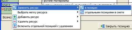 Для этого нужно на подробной форме ИнфО в первой колонке, щелкнуть правой кнопкой мыши по коду заменяемого ресурса. Появится меню, в котором есть пять вариантов воздействия на ресурсную часть норматива. 1. Заменить ресурс. Позволяет произвести замену ресурса (машины или материала), данного в норме, на другой ресурс из кодификатора ресурсов АВС. 2. Вставить метку ресурса. Позволяет для ресурса без метки (стоимость ресурса не учитывается при расчете), данного в норме, выбрать метку «С» или «М». 3.1. Добавить ресурс из кодификатора. Применяется в том случае, когда в норму требуется добавить ресурс, который используется при выполнении работы, но не учтен в норме. Такой ресурс нужно выбирать из кодификатора ресурсов АВС.