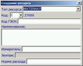 3.2. Добавить новый ресурс. Применяется в том случае, когда в норму требуется добавить ресурс, которого нет в кодификаторе ресурсов. При использовании этого пункта появляется форма для задания всех параметров ресурса. Код материала нужно задавать в диапазоне от 27000 до 30000, а код машины – в диапазоне от 3400 до 3499. Такие диапазоны кодов оставлены в кодификаторе ресурсов АВС свободными, для создания пользователем собственных ресурсов. 4. Удалить ресурс. Используется для удаления ресурса (если он не используется при выполнении работы) из списка ресурсов. 5. Включить отдельной позицией с удалением. Применяется в том случае, когда из нормы ресурс удаляется, но такой ресурс включается в исходные данные отдельной позицией. Норма расхода ресурса рассчитывается путем умножения нормы расхода из позиции на объем. 5. Заменить ресурс. При замене ресурса откроется окно: