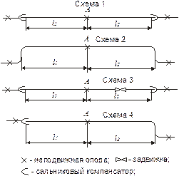 Схема 1. С обоих сторон неподвижной опоры А расположены сальниковые компенсаторы. Торцевые сечения участков трубопровода с обеих сторон опоры А открыты. Осевое усилие внутреннего давления не передается (а =0). Схема 2. С обоих сторон опоры А расположены участки с естественной компенсацией. Торцевые сечения участка закрыты отводами с обоих сторон опоры А. Усилия внутреннего давления передаются, но они противоположны и равны (а =0). Схема 3. На трубопроводе установлена задвижка. При ее закрытии с обеих сторон может установиться разное давление. Появится осевое усилие ((а =1). Схема 4. С одной стороны – сальниковый компенсатор, с другой – гнутый (упругий) компенсатор. Осевое усилие внутреннего давления направлено от неподвижной опоры в сторону упругого компенсатора.