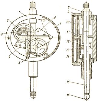 1 – корпус, 2 – пружинный волосок, 3 – зубчатое колесо, z = 100, 4 – кронштейн, 5 – пружина, 6 – кронштейн, 7 – крышка, 8 – втулка, 9 – поворотное кольцо, 10 – стрелка отсчетных сотых долей миллиметра, 11 – зубчатое колесо, z = 10, 12 – зубчатое колесо, z = 100, 13 – зубчатое колесо, z = 16, 14 – циферблат, 15 – измерительный стержень, 16 – шарик.