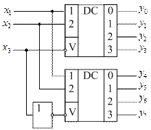Мал. 2.4. Схема включення дешифраторів для збільшення числа вхідних змінних і числа виходів.