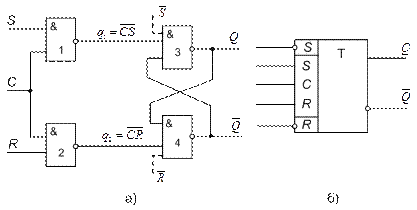 Рис. 3.5. Синхронний RS-тригер: а - логічна структура; б - умовне позначення