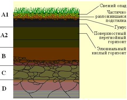 С — материнская почвообразующая порода, мало затронутая почвообразовательным процессами, горная порода, из которой образовалась данная почва. В настоящее время к профилю почв также добавляются: G — глеевый горизонт образуется при постоянном или временном избыточном увлажнении в условиях плохой аэрации почв. При недостатке кислорода в почве развиваются восстановительные процессы, в результате которых образуются закисные соединения железа, марганца и других элементов, придающие почве голубоватые, синие, зеленовато-серые и другие тона. Поскольку оглееность может проявиться в любом почвенном горизонте, к основному символу горизонта добавляется буква g, например: A2g, Bg, Cg. D — подстилающая порода — горная порода, залегающая ниже материнской. Она вычленяется там, где верхняя и нижняя части профиля сформировались на различных породах. Если весь слой материнской породы захвачен почвообразовательным процессом, то подстилающая порода может лежать непосредственно под почвой, а не под материнской породой горизонта С.