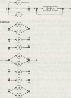 □ круглые скобки означают, что из всех перечисленных внутри них цепочек □ квадратные скобки означают, что указанная в них цепочка может встречать □ фигурные скобки означают, что указанная внутри них цепочка может не встре □ запятая служит для того, чтобы разделять цепочки символов внутри круглых □ кавычки используются в тех случаях, когда один из метасимволов нужно Вот как должны выглядеть правила рассмотренной выше грамматики G, если их записать с использованием метасимволов: <число> -» [(+.-)]<цифра>{<цифра>} <цифра> ->0|1|2|3|4|5|6|7|8|9 Вторая строка правил не нуждается в комментариях, а первое правило читается так: «число есть цепочка символов, которая может начинаться с символов + или -, должна содержать дальше одну цифру, за которой может следовать последовательность из любого количества цифр». В отличие от формы Бэкуса—Наура, в форме записи с помощью метасимволов, как видно, во-первых, убран из грамматики малопонятный нетерминальный символ <чс>, а во-вторых — удалось полностью исключить рекурсию. Грамматика в итоге стала более понятной. Форма записи правил с использованием метасимволов — это удобный и понятный способ представления правил грамматик. Она во многих случаях позволяет полностью избавиться от рекурсии, заменив ее символом итерации {} (фигурные скобки). Как будет понятно из дальнейшего материала, эта форма наиболее употребительна для одного из типов грамматик — регулярных грамматик. Запись правил грамматик в графическом виде При записи правил в графическом виде вся грамматика представляется в форме набора специальным образом построенных диаграмм. Эта форма была предложена при описании грамматики языка Pascal, а затем она получила широкое распространение в литературе. Она доступна не для всех типов грамматик, а только Определение грамматики. Форма Бэкуса—Наура 359
