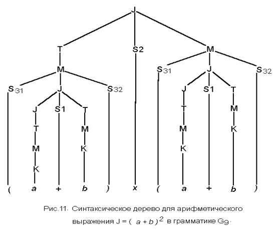Полученное дерево имеет крону, т.к. все концевые вершины есть образы терминальных символов. Последовательность ветвей, связывающая вершины <выражение>, <терм>, <множ-ль>, <перем-я>, <идент-перем>, "i", формирует левое поддерево синтаксического дерева. Можно отметить, что при построении синтаксических деревьев всюду использовали только соединительную связку "и", т.е. в правых частях используемых продукций не было разделительной связки "или". При наличии в правой части хотя бы одной продукции разделительной связки "или" формируется второе альтернативное синтаксическое дерево, позволяющее делать выбор синтаксической конструкции под заданную цепочку терминальных символов. Пример 23. Пусть дана грамматика G9 (пример 14). Построить синтаксические деревья для арифметических выражений, заданных начальным символом грамматики J: a) J= a + b2; см.рис. 9; b) J= a 2 + b2; см.рис.10; c) J= (a + b) 2; см.рис.11; d) J= a x b + a /(a - b); см.рис.12;