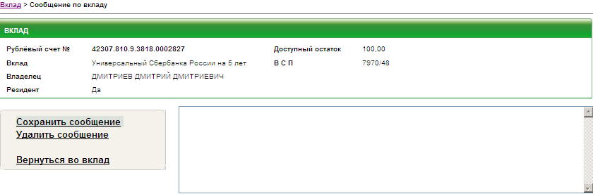 После ввода нужно перейти по ссылке Сохранить сообщение. Введенное сообщение будет отображаться всегда при обращении оператора к данному вкладу.