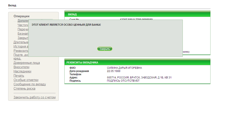 Рис. 181. Сообщение при открытии вклада при выполнении операций