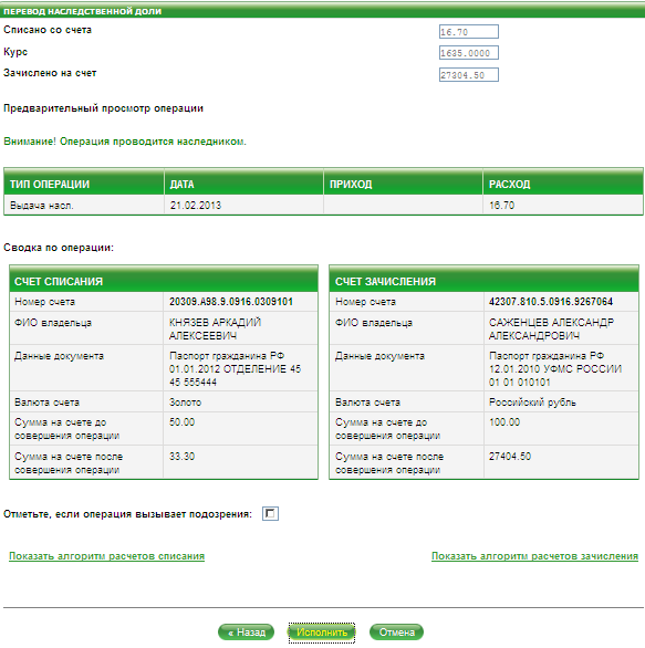 Наследственная доля пересчитывается в рубли по курсу продажи Банком обезличенного металла и зачисляется на счет получателя