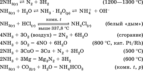 В соответствии с принципом Ле‑Шателье увеличение выхода аммиака должно происходить при повышении давления и понижении температуры. Однако скорость реакции при низких температурах очень мала, поэтому процесс ведут при 450–500 °C, достигая 15 %‑ного выхода аммиака. Непрореагировавшие N2 и Н2 возвращают в реактор и тем самым увеличивают степень протекания реакции. Азот химически пассивен по отношению к кислотам и щелочам, не поддерживает горения. Получение в промышленности – фракционная дистилляция жидкого воздуха или удаление из воздуха кислорода химическим путем, например по реакции 2С (кокс) + O2 = 2СО при нагревании. В этих случаях получают азот, содержащий также примеси благородных газов (главным образом аргон). В лаборатории небольшие количества химически чистого азота можно получить по реакции конмутации при умеренном нагревании: N‑IIIH4NIIIO2(т) = N20 + 2H2O (60–70 °C) NH4Cl(p) + KNO2(p) = N20↑ + KCl + 2H2O (100 °C) Применяется для синтеза аммиака, азотной кислоты и других азотсодержащих продуктов, как инертная среда проведения химических и металлургических процессов и хранения огнеопасных веществ. Аммиак NH3. Бинарное соединение, степень окисления азота равна – III. Бесцветный газ с резким характерным запахом. Молекула имеет строение незавершенного тетраэдра [: N(H)3)] (sр3‑гибридизация). Наличие у азота в молекуле NH3 донорной пары электронов на sр3‑гибридной орбитали обусловливает характерную реакцию присоединения катиона водорода, при этом образуется катион аммония NH4+. Сжижается под избыточным давлением при комнатной температуре. В жидком состоянии ассоциирован за счет водородных связей. Термически неустойчив. Хорошо растворим в воде (более 700 л/1 л Н2O при 20 °C); доля в насыщенном растворе равна = 34 % по массе и = 99 % по объему, рН = 11,8. Весьма реакционноспособный, склонен к реакциям присоединения. Crорает в кислороде, реагирует с кислотами. Проявляет восстановительные (за счет N‑III) и окислительные (за счет НI) свойства. Осушается только оксидом кальция. Качественные реакции – образование белого «дыма» при контакте с газообразным НCl, почернение бумажки, смоченной раствором Hg2(NO3)2. Промежуточный продукт при синтезе HNO3 и солей аммония. Применяется в производстве соды, азотных удобрений, красителей, взрывчатых веществ; жидкий аммиак – хладагент. Ядовит. Уравнения важнейших реакций: