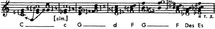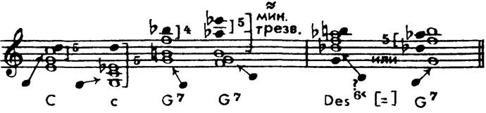 (Если в аккорде два или несколько равных сильных интервалов, за основу принимается нижний из них.) Следует обратить внимание на то, что в иных более сложных структурах аккорда происходит полное расхождение между понятиями «основного тона» и «примы». Так, в соединениях f-a-c 1 -dis 1— c-g-c 1 -e 1и des-as-f l- h l— c-g-e l -c 2 основные тоны первого аккорда каждой из двух пар расположены в басу — f и des (терции терцовых рядов), что находится в убедительном соответствии со слуховым восприятием. Никто не может слышать главным звуком первого аккорда dis;соединение основных тонов здесь кварто-квинтовое f-с, а не в немыслимо сложном отношении увеличенной секунды (!) dis-c. Но есть созвучия более сильные, чем даже сильнейшие из интервалов. Это консонирующие трезвучия — мажорное и минорное с их обращениями (квартсекстаккордом и секстаккордом), а также полный и неполный мажорный септаккорд (