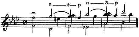 ЗАДЕРЖАНИЯ. АППОДЖИАТУРА В строгом смысле слова задержанием называется продление звука предшествующего аккорда в пределах последующего, в состав которого он не входит. Соответственно задержание состоит из трех моментов (см. пример 18): приготовления, задержания и разрешения (секундовым ходом). Продление выражается лигой либо точкой, долгой нотой (то есть средствами, показывающими, что речь идет об одном звуке, не повторяющемся и не берущемся в момент вступления последующего аккорда). Однако под задержанием принято понимать не только эту форму, но и такие, в которых отсутствует момент приготовления (так называемые «неприготовленные» задержания). В таких случаях нельзя говорить о задержании как о продлении, и возникает противоречие со словом «задержание»*. В результате получается другое толкование термина «задержание» (см.: Катуар Г. Л. Теоретический курс гармонии. Ч. II. С. 17) — не как «продление» звука прежнего аккорда, а как «задержка» со вступлением нового аккордового звука. Отсюда общее определение: задержание есть неаккордовый звук на тяжелой доле, задерживающий вступление смежного с ним аккордового. Задержания подразделяются на три основных вида: 1) приготовленные (из трех моментов: п-з-р); 2) неприготовленные (з-р); 3) брошенные (п-з; очень редкая форма). 1. Приготовленные задержания, в свою очередь, имеют две разновидности (одинаково называемые «приготовленное задержание»): 1) продленным звуком; это и есть собственно «задержание» (пример 18);