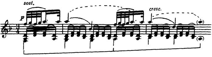 ВЫДЕРЖАННЫЕ ТОНЫ (ПЕДАЛИ) Выдержанные тоны — в верхнем голосе и в среднем голосе — родственны органным пунктам, существенно отличаясь от них логическим значением пластов ткани: при органном пункте протянутый звук функционально важнее, чем аккорды на его фоне; при выдержанных тонах аккорды важнее, чем выдержанный звук (именно в этом его принципиальное сходство с неаккордовым звуком). Выдержанные тоны (педали) имеют две разновидности: 1) протянутые (собственно «выдержанные» тоны); 37 Н. Римский-Корсаков. «Царская невеста» (схема)
