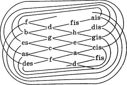 Реорганизация внутренней структуры хроматики состоит прежде всего в энгармонизации ее интервалов. Вследствие ступенной замкнутости хроматики, дальнейший рост ее структуры возможен лишь посредством прибавления новых значений тех же самых звукоступеней. Например, в системе С ступень es имеет также и значение dis. Если данная диатоника располагает возможностью перейти в несколько других, где появляются новые звуки, новые основные ступени (в терминологии П. Н. Мещанинова, диатоника обладает большим «модуляционным пространством»), то хроматика с ее двенадцатью звукоступенями при аналогичной транспозиции дает лишь перемену значений все тех же двенадцати звукоступеней. (В этом сказывается разомкнутость диатоники и замкнутость хроматики.) А так как продление цепи значений за пределы одиннадцати квинт хроматики неминуемо означает энгармонизм, то рост структуры, исходящий от хроматики, со все нарастающей интенсивностью сгущает энгармонические отношения. Система в своем дальнейшем развитии начинает «буксовать»: двенадцатиступенная хроматика растет лишь «в самое себя», возлагая всё новые значения на те же самые звукоступени, безмерно перегружая фактор контекстуальности при традиционно-тоновой их трактовке. По мере смыкания бемольного и диезного краев системы и укрепления их энгармонического равенства пространство интервальной системы становится закругленным, шарообразным, а отношения интервалов вокруг каждого тона вверх и вниз — соответственно симметричными отражениями в сфере «энгармонического шара».