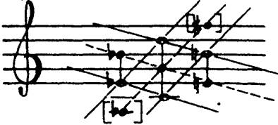 Белыми нотами обозначен опорный комплекс; черными — пропускаемые связующие тоны «реальной структурной мотивировки». подобной шарообразной парящей сферы к более простым отношениям, в музыкальной практике — избегание чистой квинты и консонирующего трезвучия. Акустическая сетка тем самым становится разрывной. Музыкально это наиболее точно соответствует гармонической системе Антона Веберна (в его гемитонике). Структурирующий комплекс подобной системы — с пропуском «дающего реальную структурную мотивировку» (Мещанинов) тона (в отношении чистой квинты, натуральной терции) — наиболее типичен в виде «вебернаккорда», «вебернгруппы» типа 3.1 (в полутонах; как правило, однако, «основной вид» опорного комплекса — с большой септимой, а не с малой секундой) (пример 107). Сплошная контекстуальность интервалов и сплошное энгармоническое приравнивание «фиктивных» интервалов к автономным (реальным) делают необходимым внесение принципа контекстуальности (обусловленности значений данным контекстом) в сами формы музыки. Отсюда распространение принципов конструктивных созвучий; крайняя форма — додекафонная серийность, где контекстуальность функциональных отношений распространяется на все 12 тонов системы. Со свойствами физического материала музыки — интервалов и складывающихся из них структур — связан еще ряд сложных проблем, касающихся уже только Новой музыки XX в. Среди них проблема «снятия» традиционных параметров и форм выработки акустической ткани (вертикали и горизонтали, аккорда и темы, ладового наклонения и тональностей); эволюция форм от аккорда — лада — темы к зоне — серии и далее — к сонору; хроматика и энгармоника — как «запредельная диатоника», с «перевернутым» значением интервалов (квинта в качестве структурного диссонанса, разграничивающая роль октавы, сходная с прежней ролью тритона); мнимое пространство и квазиструктура; соответствующие стилистические слои «нео», «полистилистика», «коллаж», квазипримитивы, квазитональность; микрохроматика, сонорика, электроника; микротемперация в значении конструктивно-расчлененной непрерывности; эволюция акустической ткани и проблема современной музыкальной морфологии (по Мещанинову).
