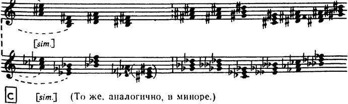 Новый шаг в системе Способина — учет распространенности в музыке мажоро-минорной системы, легкого перехода через одноименную тонику (а она не случайно стоит первой за пределами собственно диатоники) в тональности диатонические, ей столь же близкие, как и основная диатоника. Мажоро-минорное родство, собственно, должно быть у Способина не 2-й степенью или второй группой (Способин скептически высказывался о категоричности разведения родственных тональностей по разным классам-степеням), а второй половиной тональностей первой группы. Тогда всего групп должно стать не три, а две: I (а, б), II. Однако с учетом положения одноименной тоники в мажоро-минорном ладу отнесение ее в группу тональностей после всей диатоники не кажется убедительным. Если быть более последовательным в идее систематики Способина, то следовало бы, вероятно, ввести одноименную тонику в группу тоники, сделать соответственно 1-ю степень «двухъярусной» (где оба «яруса» почти равнодоступны с точки зрения двухладовой тоники), перевести неаполитанскую гармонию в группу ладовых смешений вместе с традиционными гармониями мажоро-минора, перевести мажорную медианту (большую терцию вверх) также в группу ладовых смешений, учесть обратно-функциональный характер родства некоторых гармоний (например, C-dur к h-moll находится в таком же отношении, как и Des-dur к C-dur). Получится следующий вариант систематики тонального родства (пример 142). Тоника