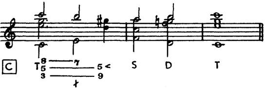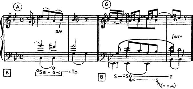 Решающим признаком S является фундаментальный ход баса, 4-1, типичный для сильно выраженной S и нарушающий обычное ведение звука 4 в функции D. Изредка субдоминантовый уменьшенный встречается и в обычных полных кадансах (Глюк, «Орфей и Эвридика», 1-й хор, c-moll; Бетховен, главная тема Largo e mesto сонаты ор. 10 № 3). Особо изысканный случай ° S64 < в подобном кадансе — см. пример 160. Благодаря предъемному тону 4< в аккорде °S6 возникает побочная связь типа D-T с аккордом Dp, зачинающая «фригийско-уменьшенную» доминанту Функциональные спутники могут приобретать и менее обычные формы. Так, в сочетании с повышением тонической квинты