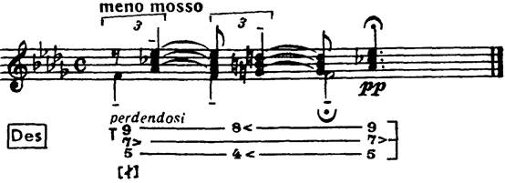 Неосуществляемая функция побочной доминанты к Тр едва ли образует здесь даже субсистему. Наконец, в виде исключения возможно образование и функциональных спутников 2-го порядка, то есть побочных форм функции, где основной тон отстоит от фундаментального не на одну терцию вверх или вниз (как в «спутниках» 1-го порядка), а на две, то есть на расстояние квинты, что типично для основных функций. Понятно, что для возникновения таких функциональных значений нужна очень большая «пробивающая» сила данной функции, притом еще редкостные условия. В примере 170A подобие функционального спутника 2-го порядка можно найти в мелодии, фигурирующей верхнюю часть Т9, которая совпадает с доминантовым трезвучием (подобно тому, как это очень часто бывает и с функциональным спутником 1-го порядка: Чайковский, финал 4-й симфонии, т. 2; Рахманинов, Этюд-картина es-moll ор. 39 № 5, начало второго предложения, т. 2 и т. п.). В примере 170Б несколько «оторвавшаяся» от корня часть тонического нонаккорда (трезвучие as-moll) уже практически совпадает с тем, что можно считать функциональным спутником 2-го порядка. В примере 170В — изредка встречающаяся в S кварта (побочный тон), возникшая вследствие тяжелого свободного тона. В последнем образце (Г) — та же кварта вместо терции в сочетании с другими тонами (1, 6) совпадает с продлением S по терциям вниз (S8->6->4), в результате чего возникает аккорд F-dur как спутник 2-го порядка. 170 А - К. Дебюсси. «Вальс более чем медленный»