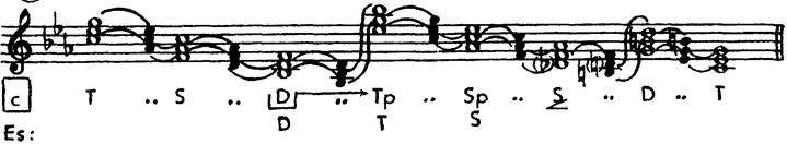 Так же как и квинтовые, они находятся под доминирующим влиянием самого главного функционального шага, автентического, и, подобно квинтовым, идут обычно вниз (пример 185А, Б; ср. с примером 158). Весь терцовый ряд: C-a-F-d-B-g-Es-c-As-f-Des-b-Ges-es-Ces-as-E-cis-A — (19 звеньев, от тоники побочной темы до доминанты главной). Обратное движение встречается редко (пример 185В). Функционально терцовый диатонический (и миксодиатонический, см. пример 185Б) ряд представляет собой дробление полного функционального шага. Функциональная смена осуществляется здесь двумя шагами (функционально — полушагами); терцовый, то есть медиантовый, шаг есть полусмена. Однако (см. пример 158) полусмена не означает математической «полуфункции». Так же как III ступень, разрешающаяся далее в тонику, не является сама равномерно «полутоникой-полудоминантой», а функционирует в качестве доминанты, так и в соответствующих звеньях терцового ряда примера 185А нет никаких особых функций помимо тоники, превращающейся в доминанту, с разрешением последней в очередную такую же, вовлеченную в разработочно-модуляционный процесс тонику (в примере 158 аналогично есть лишь Т и S). Но постепенность смены функции придает терцовому ряду смягченность, переливчатость, отличающие функциональное действие медиант от основных квинтовых функций. Отсюда начинается путь к автономным медиантам: от внедрения линейного тона (например, +D6) и образования функционального спутника (+DP) к хроматизации (+Dp<) и автономной медианте (собственный знак — М).