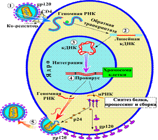 Рис. 28 Этапы репродукции ВИЧ Основными клетками-мишенями для ВИЧ являются различные СD4+ клетки, имеющие дифференцировочные рецепторы СD4 (Cell differention antigen). Это прежде всего Т-хелперы, около 40% моноцитов крови, 5% В-лимфоцитов, а также некоторые макрофаги тканей, дендритные клетки, микроглиальные клетки и другие. Выявлена также способность ВИЧ поражать клетки, не имеющие рецепторов СD4 - эпителиальные, эндотелиальные и другие. Различают следующие основные этапы взаимодействия ВИЧ с клеткой-мишенью. Адсорбция вируса на клетке, несущей рецепторы СD4, путем присоединения поверхностных гликопротеинов gр120 к этим рецепторам (при участии гликопротеина gр41, способствующего проникновению вируса в клетку). Вирус проникает в клетку путем эндоцитоза или при слиянии вирусной и клеточной мембран. Оказавшись в цитоплазме клетки, сердцевина вируса депротеинизируется, высвобождается и начинает функционировать геномная РНК вируса. На матрице геномной плюс-РНК с помощью вирусной обратной транскриптазы (РНК-зависимой ДНК-полимеразы) синтезируется комплементарная нить ДНК. Затем нить вирусной плюс-РНК разрушается рибонуклеазой и на ее место встраивается вторая нить ДНК, образуя двунитчатую молекулу ДНК. Эта структура транспортируется в ядро клетки и с участием интегразы встраивается в геном клетки — хозяина. Интегрированный геном-провирус вызывает состояние вирусной интегративной инфекции на протяжении длительного времени, вплоть до гибели клетки, или переходит в дочерние клетки при их делении. В большем или меньшем количестве инфицированных клеток происходит переход к продуктивной инфекции. На этот процесс влияют многие экзогенные и эндогенные факторы, его запускают LTR, индуцирующие транскрипцию вирусных генов. На ДНК-провирусе образуются копии вирусной плюс-РНК, часть из них - будущие геномные РНК, другие - выполняют функции и-РНК, осуществляя трансляцию вирусных белков, как регуляторных, так и структурных. Сборка вириона начинается с формирования сердцевины вируса, состоящей из двух идентичных нитей геномной РНК с ассоциированными ферментами и капсида. Вирус приобретает суперкапсид при отпочковывании вируса от клетки через участок модифицированной клеточной мембраны, в которую встроен трансмембранный gр41 и наружу выступает gр 120, изнутри к мембране прилегает матриксный слой. Часто цикл репродукции заканчивается гибелью клетки, его продолжительность 1-2 суток. Резистентность. ВИЧ малоустойчив к воздействиям многих химичеуких и физических факторов. Он быстро гибнет при действии обычных дезинфектантов, при нагревании до 60°С инактивируется за 30 минут, при кипячении мгновенно, менее чувствителен к действию солнечного света, УФ-лучей, радиации. ВИЧ хорошо переносит высушивание, сохраняясь в высохшей крови до двух недель. В донорской крови вирус остается жизнеспособным в течение нескольких лет. 4. Эпидемиология Источник и резервуар ВИЧ-инфекции - человек на всех стадиях заболевания. Наибольшая концентрация ВИЧ наблюдается в крови, сперме, секретах цервикального канала и влагалища. Именно через эти биологические жидкости происходит инфицирование. Считается, что инфицирующая доза составляет около 10 тысяч вирионов. ВИЧ обнаружен также в слезах, слюне, поте, ликворе, моче и грудном молоке, но в незначительном количестве, поэтому эти би