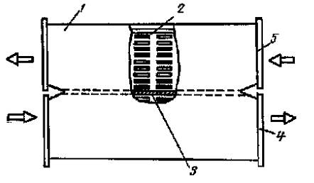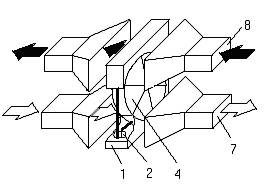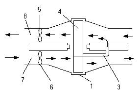 1 – корпус; 3 – продувочная камера; 4 – насадка; 5 – вытяжной вентилятор; 6 – приточный вентилятор; 7 – приточный воздуховод; 8 – вытяжной воздуховод. Рис. 8.3 Схема регенеративного вращающегося теплоутилизатора (разрез)