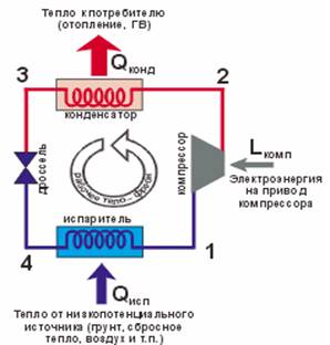 Рис. 8.4 Принципиальная схема работы компрессионного теплового насоса