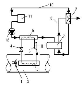 1 – вытяжной вентилятор; 2 – поток удаляемого воздуха; 3 – испаритель; 4 – регулирующий вентиль; 5 – конденсатор; 6 – компрессор; 7 – газовый двигатель; 8 – отходящие газы; 9 – теплоутилизатор отходящих газов; 10 – трубопроводы системы отопления; 11 – отопительный прибор; 12 – насос. Рис. 8.5 Принципиальная схема системы отопления с тепловым насосом, использующим газовый двигатель