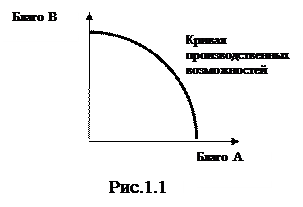 Предпосылками возникновения экономической (хозяйственной деятельности) людей выступают потребности, удовлетворение которых возможно за счет определенных ресурсов. Потребности - выражение необходимости существования и развития человека. Виды потребностей - многообразны, их можно классифицировать по множеству критериев, например: 1. По типу благ: а) потребность в средствах существования (жизненно-необходимые потребности); б) потребность в социально-культурных благах (образование, досуг и т.п.); в) потребность в средствах деятельности (производительные блага - станки, оборудование, сырье, материалы и т.п.); г) потребность в социально-престижных благах (блага, выражающие социальный статус человека). 2. По способу удовлетворения потребностей: а) индивидуальные потребности; б) коллективные потребности. Еще один вариант классификации потребностей предложен в так называемой «пирамиде потребностей» А.Маслоу, где в основании лежат жизненнонеобходимые потребности; следующий уровень представляют потребности, связанные с обеспечением безопасности; затем – потребности в общении и любви, четвертый уровень связан с потребностями в самоутверждении, а вершину пирамиды занимает потребность в самореализации. Динамика потребностей выражается в законе возвышения потребностей, который неразрывно связан с процессом развития общества и предполагает постоянное возрастание и изменение структуры, качества и количества человеческих потребностей. Возможности для удовлетворения потребностей предоставляют ресурсы. Ресурсы - это источники обеспечения потребностей. Виды ресурсов можно определять по нескольким критериям: 1. По происхождению: а) природные (земля, вода, полезные ископаемые); б) людские (трудовые); в) накопленные (созданные ранее материальные блага: здания, оборудование, дома, инфраструктура и т.п.); г) финансовые; д) информационные. 2. По возможности восстановления: а) воспроизводимые; б) невоспроизводимые. 3. По времени воспроизводства: а) постоянные (фиксированные на данный период времени, не способные увеличиться в краткосрочном периоде: оборудование, здания); б) переменные (способные изменяться в краткосрочном периоде: сырье, материалы) Для ресурсов характерна ограниченность, особенно в краткосрочном периоде, что и порождает основную экономическую проблему: столкновение постоянно возрастающих потребностей с ограниченными ресурсами. В условиях постоянно возрастающих потребностей и ограниченных ресурсов основной проблемой экономики становится проблема: "Что производить?". Решение этой проблемы возможно через анализ кривой производственных возможностей и осуществления рационального (эффективного) выбора. Кривая производственных возможностей представляет собой распределение имеющихся на данный момент в обществе ресурсов на производство альтернативных товаров (Рис.1.1).
