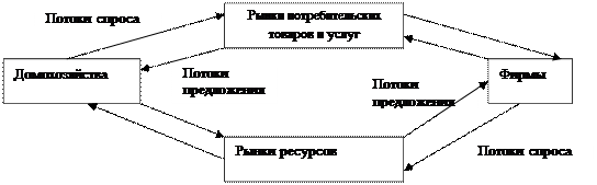 Экономические отношения реализуются экономическими субъектами, действующими активно и самостоятельно в процессе производства, распределения, обмена и потребления благ. Основными экономическими субъектами считаются: фирмы, домашние хозяйства, государства и заграница. Взаимодействие экономических субъектов образует экономический кругооборот - непрерывное движение реальных экономических благ, сопровождающееся встречным потоком денежных доходов и расходов. Простейшая модель кругооборота представлена взаимодействием фирм и домохозяйств (Рис.1.2), но и эта модель уже отражает главное в рыночной экономике - равновесие спроса и предложения, взаимозависимость производства и потребления.