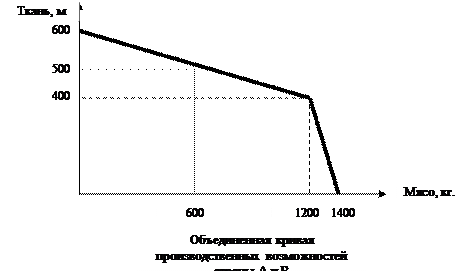 б) Если все ресурсы стран А и В будут направлены на производство ткани, то объединенная экономика сможет произвести ее в количестве 600 м. После принятия решения о начале производства мяса (и о снижении производства ткани) первыми сменят сферу деятельности те работники, результативность которых в производстве ткани относительно ниже, а в производстве мяса – выше, т.е. бывшие граждане страны В. Таким образом, при снижении производства ткани с 600 м. до 400 м. (и росте производства мяса от нуля до 1200 кг.) все бывшие граждане страны В постепенно будут менять место работы. Альтернативные издержки производства 1 кг. мяса на этом участке кривой производственных издержек (КПВ) будут постоянны и равны 1/6 м. ткани (альтернативные издержки производства 1 м. ткани равны 6 кг. мяса) В точке, где объединенная экономика производит 400 м. ткани и 1200 кг. мяса, все граждане двух стран трудятся в той сфере, где их производительность максимальна: бывшие граждане страны А производят ткань, а граждане страны В – мясо. В случае необходимости дальнейшего наращивания производства мяса альтернативные издержки 1 кг. вырастут и окажутся равными 2 м. ткани (альтернативные издержки ткани 1 м. ткани равны ½ кг. мяса), так как менять профессию придется уже бывшим гражданам страны А, которые более искусны в ткацком деле, нежели в животноводстве. И, наконец, если все граждане двух стран будут производить мясо, его количество достигнет 1400 кг. Таким образом, КПВ объединенного государства состоит из двух участков: на первом (более пологом) участке наклон будет определяться альтернативными издержками производства мяса в стране В (1 кг. мяса = 1/6 м. ткани), на втором – в стране А (1 кг. мяса = ½ м. ткани).