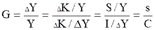 2. Модель Р.Харрода (Работа - "К теории экономической динамики", М., 1959 г.). Экономическая динамика рассмотрена на основе трех уравнений, каждое из которых выражает особый тип экономического роста: фактический темп роста производства, "гарантированный" темп роста и потенциально возможный, "естественный" темп роста. Первое уравнение - уравнение фактического темпа роста: