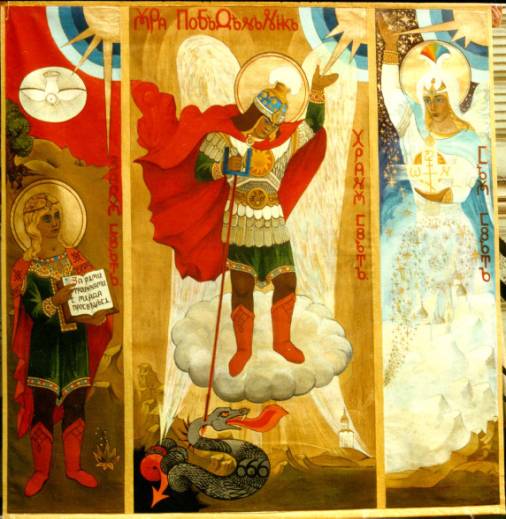 К 7500-летию со дня введения плоскостного письма на Святой Руси выдающаяся художница Н.В.Косырева сумела на большом полотне подвосстановить триптих "Юра ПоБеДенНИк". Да! Это та самая художница, которая написала образ Машеньки-подростка, т.е., мамы Исуса в предтечестве юности.