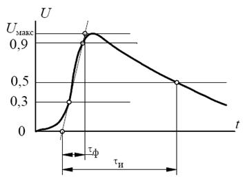 Зависимость максимального напряжения разряда от времени действия импульса называется вольт-секундной характеристикой изоляции. Поскольку начало и скорость развития ионизационных процессов зависят от значения напряжения, вольт-секундные характеристики зависят от формы импульса. Импульсное 50%-ное разрядное напряжение С целью унификации испытаний и возможности сопоставления изоляционных конструкций установлен стандартный грозовой импульс с длительностью фронта (возрастания напряжения) τ ф =1, 2 ± 0, 4 мкс и длительностью импульса τ и = 50 ±10 мкс и обозначается 1,2/50 мкс (рис. 1.15).