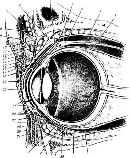 Рис. 2.3.7. Структуры переднего отдела глаза: / — верхняя прямая мышца; 2 — леватор верхнего века; 3 — соединение верхней прямой мышцы с леватором; 4 — тенонова капсула; 5 — поддерживающая связка верхнего свода; б — связка Витнелла; 7 — лобная мышца; 8 — жировая подушка брови; 9 — глазничная часть круговой мышцы глаза; 10 — краевая дуга; // — глазничная перегородка; 12 — преапоневротическая жировая подушка; 13 —пресептальная часть круговой мышцы глаза; 14 — пресептальная жировая подушка; 15 — апоневроз леватора верхнего века; 16 — верхняя часть свода конъюнктивы; 17 — мышца Мюллера; 18 — конъюнктива; 19 — «хрящевая» пластинка верхнего века; 20 — претарзальная часть круговой мышцы глаза; 21 — «хрящевая» пластинка нижнего века; 22 — мышечно-кожные включения «опускателя» нижнего века; 23 —конъюнктива; 24 — нижний конъюнктивальный свод; 25 — тенонова капсула; 26 — глазничная перегородка; 27 — связка Локвуда; 28 — нижняя прямая мышца; 29 — поддерживающая связка нижнего свода; 30 — нижняя косая мышца; 31 — капсуло-пальпебральная фасция; 32 — нижняя прямая мышца Брови и веки