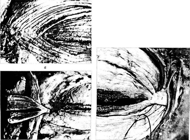 Рис. 2.3.9. Наружный «шов» века (а) и особенности строения кантальной связки (б) (по Reeh et al., 1981): a — наружный шов века (/ — верхняя претарзальная часть круговой мышцы глаза; 2 — верхняя пресептальная часть круговой мышцы глаза; 3 — наружный шов века); б — наружное канталь-ное сухожилие века (/ — отсеченная часть претарзальной мышцы; 2 — отсеченная часть пресептальной мышцы; 3 — общее наружное кантальное сухожилие, сформированное обеими пре-тарзальными мышцами) Рис. 2.3.10. Область прикрепления круговой мышцы глаза с внутренней стороны (поверхностно расположенные структуры) (по Reeh, 1981): 1 — передняя часть внутренней связки века; 2 — наружный участок внутренней связки, от которого берут свое начало поверхностные претарзальные мышцы верхнего и нижнего век; 3 — поверхностные претарзальные мышцы верхнего и нижнего век; 4 — глубокие претарзальные части мышцы верхнего и нижнего век; 5 — угловая вена, лежащая на передней поверхности мышцы Глава 2. ГЛАЗНИЦА И ВСПОМОГАТЕЛЬНЫЙ АППАРАТ ГЛАЗА