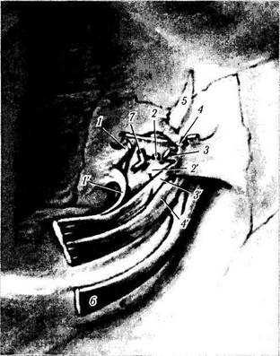 /, /' — глубоко расположенное место прикрепления претарзаль-ной части круговой мышцы верхнего и нижнего век; 2, 2' — глубоко расположенное место прикрепления пресептальной части круговой мышцы; 3, 3' — поверхностно расположенное место прикрепления претарзальной части круговой мышцы верхнего и нижнего век; 4, 4' — поверхностно расположенное место прикрепления пресептальной части круговой мышцы; 5 — поверхностно и глубоко расположенное место прикрепления глазничной части круговой мышцы верхнего века; 6 — поверхностно и глубоко расположенные места прикрепления глазничной части круговой мышцы нижнего века; 7 — место присоединения канальца к слезной диафрагме