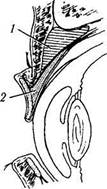 Рис. 2.3.11. Особенности прикрепления круговой мышцы глаза с внутренней стороны (глубокое расположение структур):