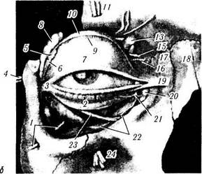 Рис. 2.3.14. Строение века: а —глазничная перегородка (/—культя внутренней кантальной связки; 2 — слезная диафрагма; 3 — наиболее слабая часть фас-циальной капсулы слезного мешка, где наиболее часто отмечается перфорация стенки; 4 — наружное кантальное сухожилие: 5 — подмышечная фасция наружного шва века: 6 — карман Эйс-лера (Eisler); 7 — дуга вокруг надблоковых сосудов и нервов; 8 — краевая (маргинальная) дуга; 9 — слезный бугорок); б—веко после удаления глазничной перегородки (/ — скуло-лицевой нерв; 2 — нижняя тарзальная пластинка; 3 —наружная связка века; 4 — скуло-височный нерв и артерия; 5 — сухожилие леватора верх- него века (обрезано); 6 — пальпебральная часть слезной железы; 7 — верхняя тарзальная пластинка; 8 — глазничная часть слезной железы; 9 — мышца Мюллера; 10 — леватор верхнего века; // — надглазничный нерв (латеральная ветвь) и артерия; 12 — надглазничный нерв (медиальная ветвь) и артерия; 13 — блок; 14 — над-блоковый нерв; 15 — подблоковый нерв; 16 — дорзальная носовая артерия: 17 — лобный отросток; 18 — носовая кость; 19 — внутренняя связка века; 20 — слезный мешок; 21 — нижняя медиальная артерия века: 22 — анастомозы с подглазничной артерией; 23 — нижняя косая мышца; 24 — подглазничный нерв и артерия)