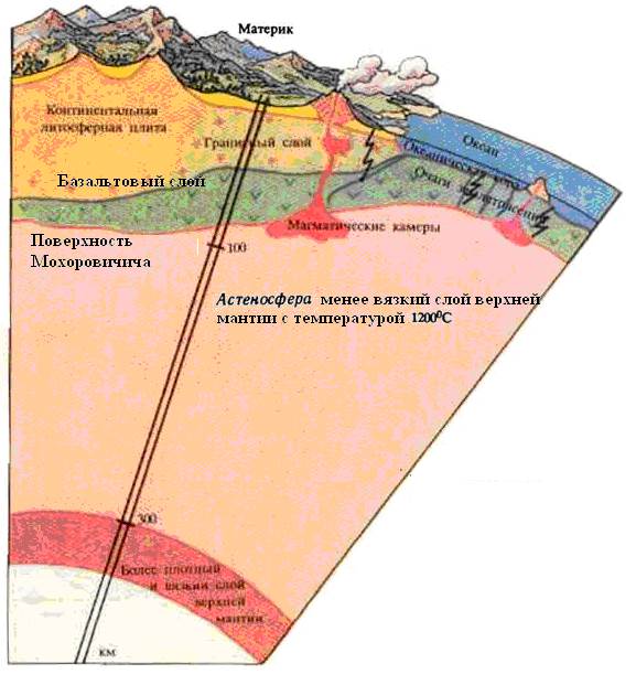 Рис.4.2 Мантия, астеносфера, поверхность Мохоровичича Земля заключена в твердую внешнюю оболочку, или литосферу, состоящую из коры и твердого верхнего слоя мантии. Литосфера расколота на огромные блоки, или плиты. Под давлением могучих подземных сил эти плиты непрерывно движутся (Рис.4.3). В одних местах их движение приводит к возникновению горных хребтов, в других края плит втягиваются в глубокие впадины. Это явление называется поддвигом, или субдукцией. Смещаясь, плиты то соединяются, то раскалываются, и зоны их стыков называют границами. Вот в этих наиболее слабых точках земной коры чаще всего и зарождаются вулканы.