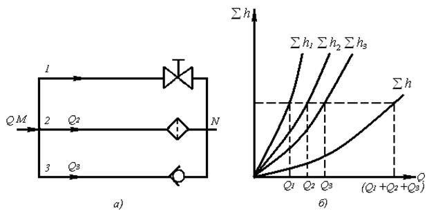 Из уравнений (1.145) и (1.146) вытекает следующее важное правило: для построения характеристики параллельного соединения нескольких трубопроводов следует сложить абсциссы (расходы) характеристик этих трубопроводов при одинаковых ординатах (Σh). Пример такого построения дай па рис, 1.95, б. Разветвленное соединение. разветвленное соединение это совокупность нескольких простых трубопроводов, имеющих одно общее сечение — место разветвления (или смыкания) труб.