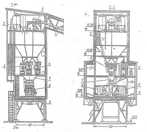 1 – стрічковий транспортер; 2 – поворотна воронка; 3 – трубопровід для пневматичного транспортування цементу; 4 – дозатори для заповнювачів; 5 – дозатор цементу; 6 – дозатор для води; 7 – завантажувальний пристрій; 8 – бетонозмішувачі; 9 – роздатковий бункер. Таблиця 6.3