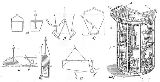 а – перекидна; б – неперекидна з двохстворковим плоским затвором; в – неперекидна із шторно-роликовим затвором; г – ківш-баддя в положенні її завантаження місткістю 3,2 м3; д – те ж на крюку крану; ж – неповоротна баддя місткістю 8,0 м3.