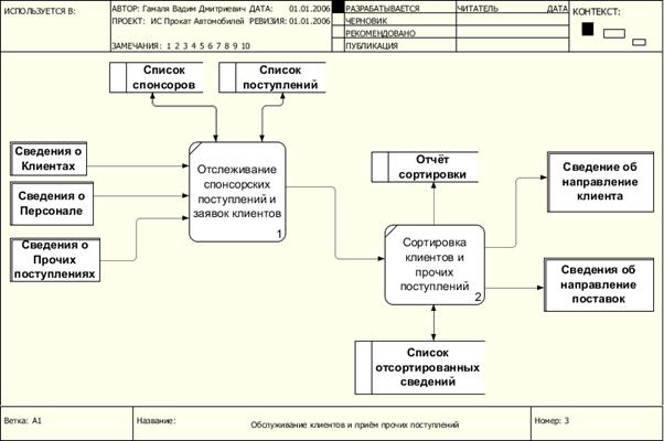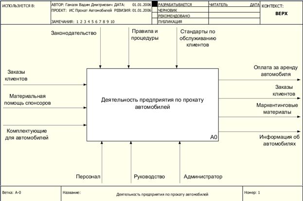 Контекстная диаграмма ИС «Проката автомобилей» показана на рисунке 1. Функциональная диаграмма первого уровня приведена на рисунке 2. На рисунках 3 и 4 показаны функциональные диаграммы второго уровня для функций «Обслуживание клиентов и приём прочих поступлений» и «Оплата за аренду автомобилей».