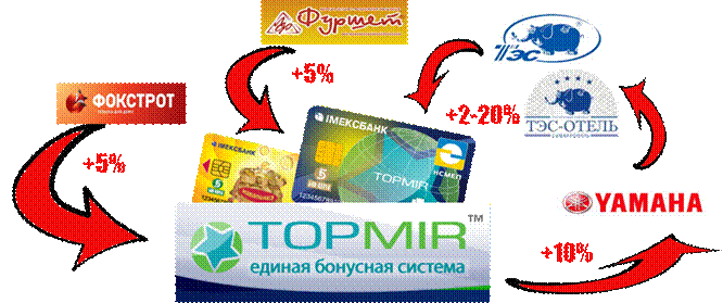 Геращенко Евгения Андреевича внимательно изучив различные программы лояльности, мы пришли к выводу, что наиболее действенная схема по привлечению и удержанию клиентов - это начисление бонусов при оплате за каждую покупку. Национальные торговые сети, лидеры продаж в Украине, используют тот же принцип: Товар + Бонус = лояльность покупателей, которые возвращаются к продавцу использовать накопленные бонусы. Приглашаем Вас стать торговым партнером Бон клуба «ТОПМИР», аналогов в Украине нет! К нам уже присоединились национальные торговые сети «ФУРШЕТ», «ФОКСТРОТ», азс «ТЭС-ТНК», магазин «YAMAHA», отели, санатории, медицинские клиники. Все торговые партнеры Единой Бонусной Системы начисляют владельцам Бон карт бонусы при оплате за товар, услугу согласно оговоренному % от суммы оплаты. Все бонусы в гривне перечисляются торговыми партнерами на расчетный счет процессинг центра Единой Бонусной Системы Бон карта. При расчете бонусами с Бон карты на счет торгового партнера поступают деньги в эквиваленте 1 бонус=1 гривна. Бонусы начисляются не только при оплате с карты, но и при наличном расчете. Это важное отличие от аналоговых бонусных объединений!