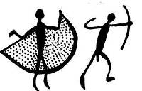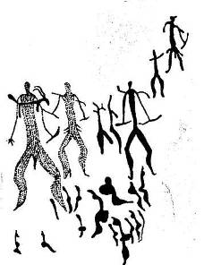 Действующие лица: стрелок из лука (справа) и тореадор (слева). Он одет в плащ, крылья которого управляются двумя палками, удерживаемыми руками. В правой руке короткий стилет — орудие закалывания быка. Как умудряются археологи принимать тореадоров за ряженых шаманов — уму непостижимо. Удачу в охоте приносит не колдун, а точное знание особенностей поведения животного. художников на эту тему. Мне до сих пор становится жутко от картины «Охота на мамонтд) украшавшей в течение многих десятилетий школьные учебники. Мамонт провалился задом в какую то яму, а на него набросилась беспорядочная oрава мужчин и женщин. Одни бросают дротики, другие тычут копьями куда попало, третьи швыряют огромные камни. Кто-то в ужасе бежит прочь многие уже убиты и ранены, а до гибели мамонта еще далеко. Но ведь и в наше время пигмеи охотятся на слонов древним способом, но справляются с животным два-три человека, применяя совсем маленькие инструменты и почти не рискуя собой, В древних охотах главное — отточенные приемы, основанные на знании слабостей животного и его уязвимых мест. И уж конечно, женщины в охоте не участвовали. Они оставались с детьми на стоянках, а промыслом занимались бригады мужчин. Охота на крупных и опасных животных требует полной уверенности друг в друге, непременной взаимной страховки и выручки. Наскальные рисунки донесли до нас некоторые из охотничьих приемов. Вот несколько почти безоружных людей, преграждая путь быку, дразня его чем-то вроде плаща тореадора. Вот бык, опустив рога, атакует «плащ», проносясь рядом с телом одного из тореадоров, и «плащ» оказывается на морде быка. Вот он встал как вкопанный, и тореадор закалывает его коротким ножом — точно тем же движением и в то же место, как это делают во время испанской корриды. А вот другой сюжет, повторенный в самых разных вариантах. Несколько безоружных охотников, пригнувшись, стоят в линии один за другим, а на них несется бык. Первый охотник пытается повиснуть у него на голове. Если он промахивается, то перелетает через животное в опорном прыжке через голову и приземляется позади него В это время тот же прием повторяет следующий охотник и т.д. Узнаете? Подобный рисунок на критской фреске искусствовед11 назвали «акробаты и Минотавр». Но в Португалии до сих пор сохранилась коррида, в которой точно тем же приемом шесть юношей запросто валят и обездвиживают быка, а сами живы-здоровы. А если один из охотников окажется трусом? Бригаде придется с ним расстаться. Лови в одиночку сусликов или занимайся каким-нибудь другим делом. Это был один из немногих периодов в истории человек, когда проходил жестокий естественный отбор в таких качеств, как предприимчивость, изобретательность, смелость, верность За всю предшествующую историю человечества не найдено ни одного скелета человека с благополучно сросшимся переломом ноги. Вывод ясен: неспособного идти бросали на произвол судьбы С периода Великих Охот начинают попадаться скелеты со следами заживших травм. Охота сделала мужчин верными друзьями.И совсем трогательная находка: захоронение семнадцатилетнего юноши-карлика, страдавшего такими ужасными уродствами скелета, что он ни на что не был годен, был обузой группы, особенно при переходах в гористой местности. Этому свидетельству сострадания и милосердия 11,5 тыс. лет. Охота невероятно расширила 