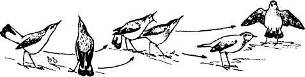 В территориальном конфликте двух самцов каменки-плясуньи выигрывает тот, кому принадлежит участок (на рисунке он дальше от нас), потому что агрессор знает свою неправоту. Померившись ростом (слева), самцы встают параллельно, трясут хвостами и кричат. У хозяина участка все получается лучше, потому что он не заторможен запретом. Наконец, втор-женец принимает позу приуменьшения себя и умиротворения, а хозяин — позу превосходства и торжества победы (справа).
